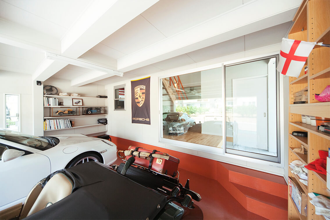 旦那様の趣味の愛車を眺めることができるガレージ。外観デザインや内装も車に合わせてスタイリッシュに。ガレージ内には車に関する本やミニチュアカーを飾ることができる棚を設けました。