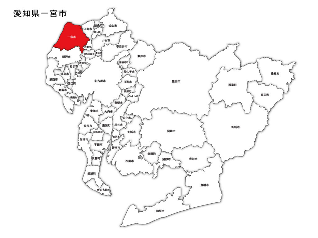 一宮市は愛知県の北西部に位置する岐阜県との県境にある街です。面積は約114Km2で人口が約38万人です。名古屋への通勤通学に便利なことから、ベッドタウンとしてたくさんの人々が暮らしています。