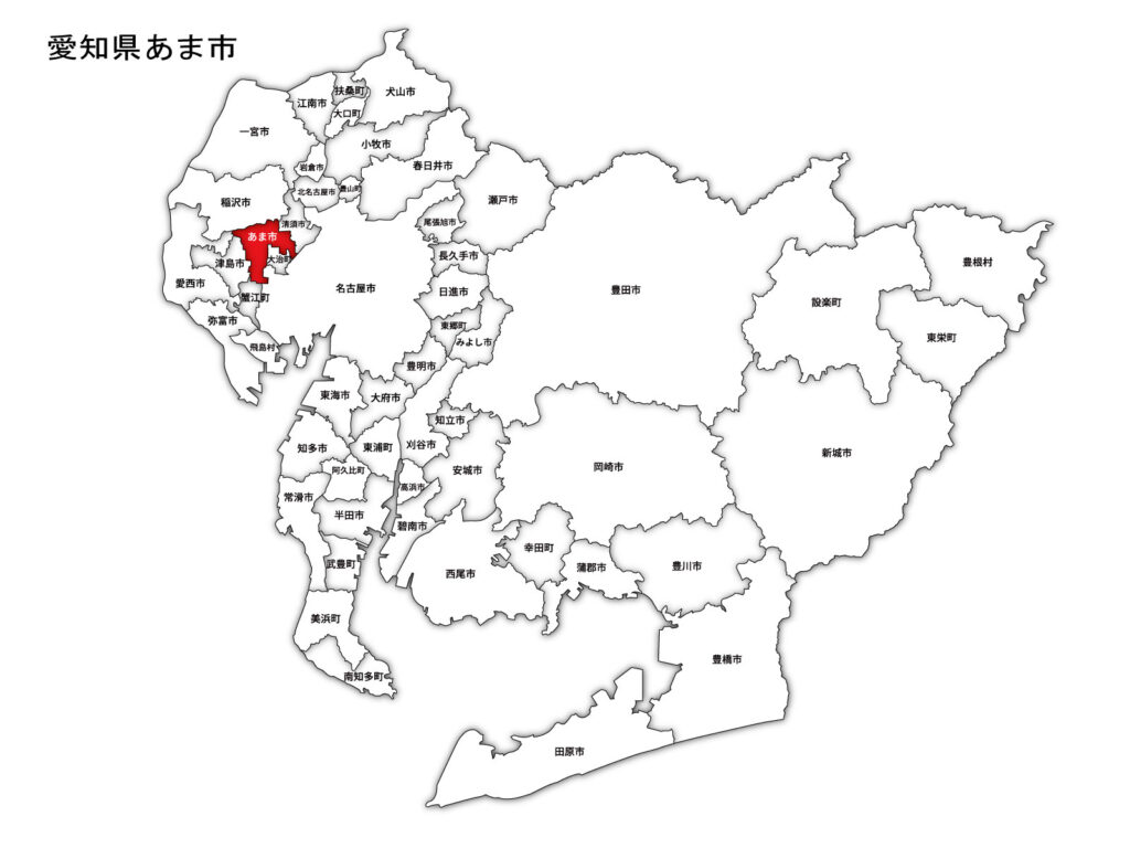 あま市は愛知県西部に位置し、ほぼ全域が海抜0mの平坦なエリアです。隣接する自治体は名古屋市・清須市・稲沢市・愛西市・津島市・蟹江町・大治町で、濃尾平野と豊かな河川環境の恩恵を受け、古くから農業が盛んな地域として発展してきました。