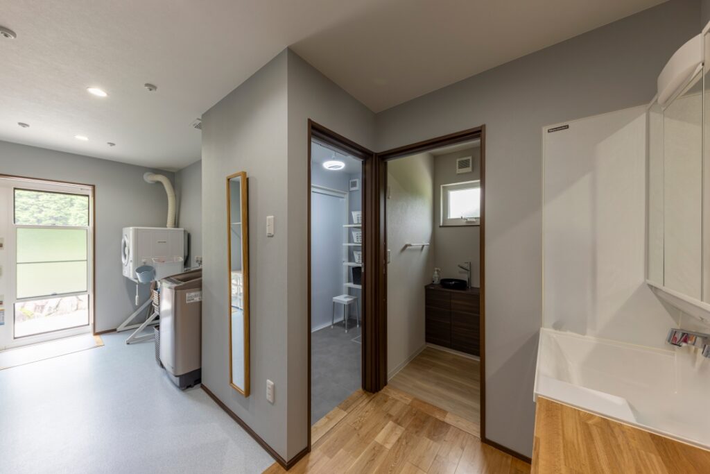 洗面室の隣にランドリールームを設け、隣接してファミリークローゼットを配置。