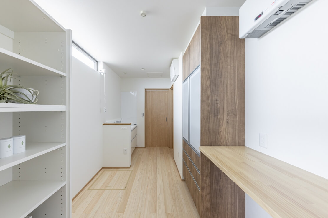 キッチンとダイニングを横並びにし、パントリーを隣接させた構成。キッチン奥に水まわりもまとめました。