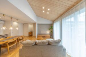 私たちの設計事例で好評なのが、「勾配(こうばい)天井」の採用です。通常の平らな天井ではなく、屋根の斜めの形をそのまま室内の天井に活かすことで、リビングに入った瞬間に視線が上へと抜け、実際の面積以上の圧倒的な開放感を感じることができます。