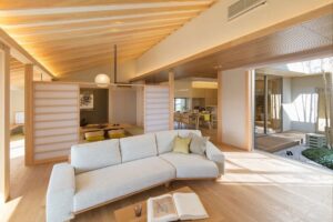 平屋はリビングルーム、個人の寝室、水回りなどのすべての生活空間が同じフロアに集約されています。すべての個室をリビングに面して配置することが可能となり、家族間のコミュニケーションを促す効果があります。