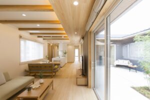 一方で、家の内側にある中庭に面した壁には、天井近くまで届くような大きな窓を連続して並べます。この設計により、太陽の光は中庭という「光の通り道」を通って、家の奥深くまでたっぷりと降り注ぎます。外の環境に左右されることなく、一日中明るく開放的なリビングを作ることができるのです。