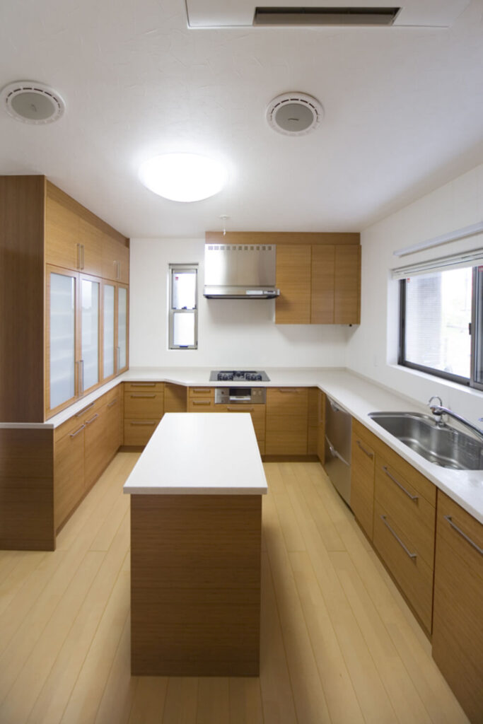 シンクや調理台、コンロなどをU字に配置したキッチン。動線が短く、手の届く範囲に調理器具を集結させることができます。