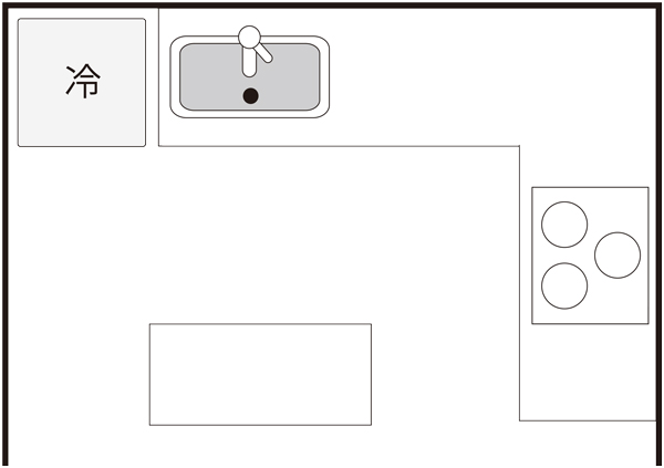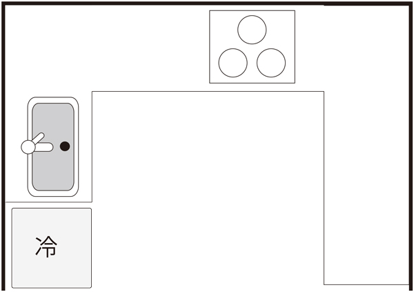シンクや調理台、コンロをL字に配置したキッチン。両面、または片面を壁につけて設置します。
