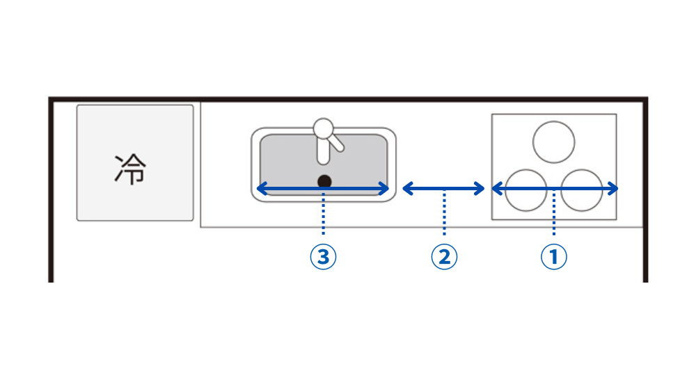 冷蔵庫・シンク・コンロを結ぶ「トライアングル動線」は、合計510cm程度が理想とされ、作業がスムーズになります。