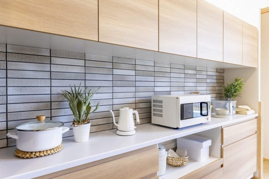 カラーやデザインのバリエーションが豊富で、インテリアに合わせやすい素材。比較的コストを抑えつつ、明るくナチュラルな雰囲気のキッチンを演出できます。