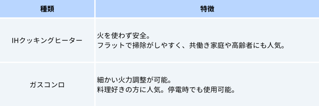 最近ではIH+ラジエントヒーターの組み合わせや、デザイン性に優れたビルトインコンロなど、選択肢も豊富です。