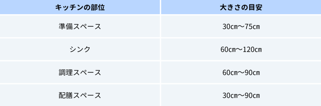 一般的な調理スペースの間口サイズは60~90㎝で、奥行きは65㎝以上あれば快適に作業をすることができます。