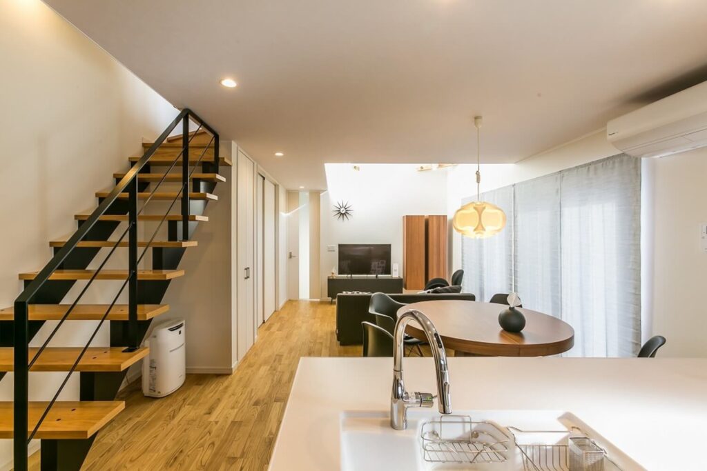 吹き抜けは、開放感があって風通しが良い心地よい空間をつくってくれます。ほかの部屋とも緩やかにつながるので、どこにいても家族の気配を感じられ、コミュニケーションがとりやすくなるのも魅力です。