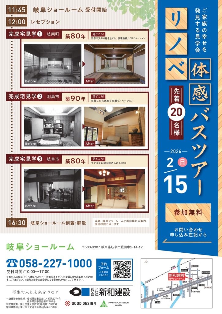 ・お問合せ/お申し込み:新和建設 岐阜ショールーム(058-227-1000)または下記イベント予約フォームへ