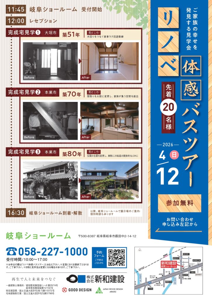 ・お問合せ/お申し込み:新和建設 岐阜ショールーム(058-227-1000)または下記イベント予約フォームへ