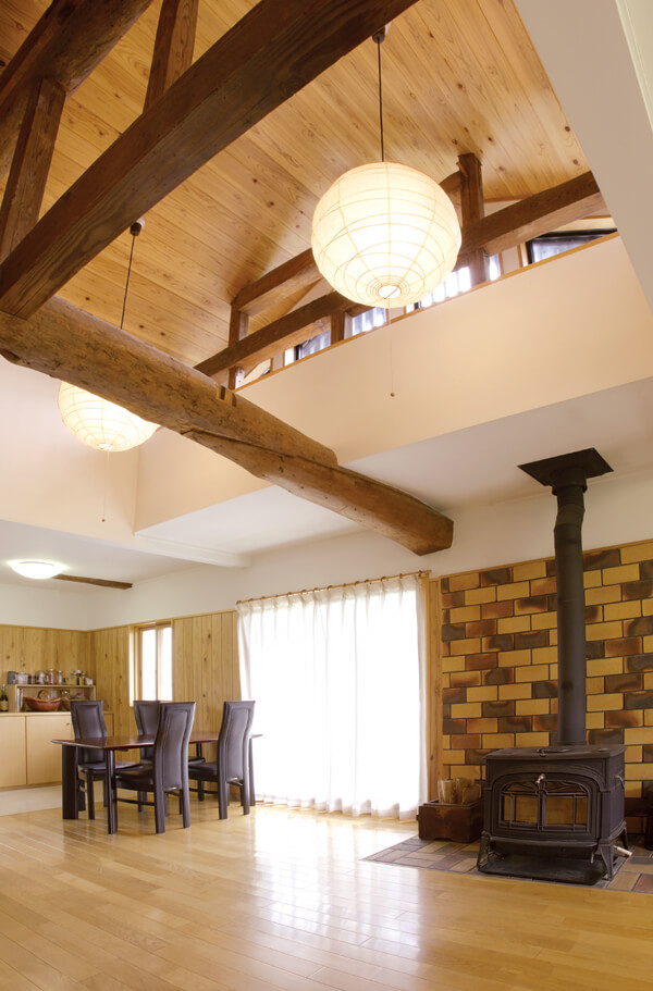 構造の梁を見せる構法です。室内に木の温かみがプラスされ、天井高が高くなるのが特徴です。無垢との相性もよく、部屋が広く、明るく見えるので人気の高い仕様です。