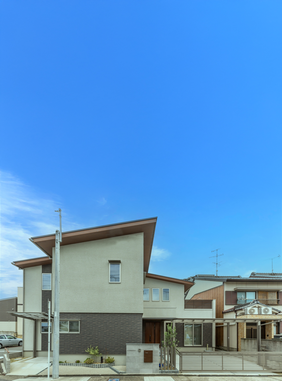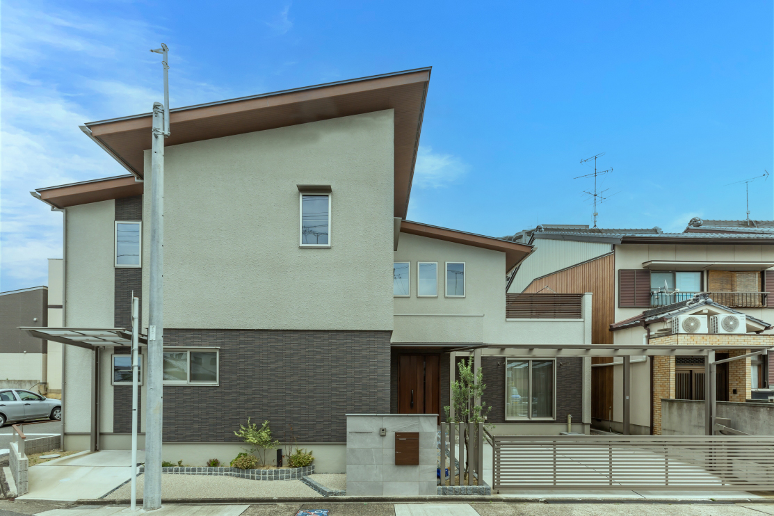 建物をL字型にすることで、1階2階ともに光がよく入る明るい住まいとなりました。外壁は塗り壁とタイルで仕上げました。