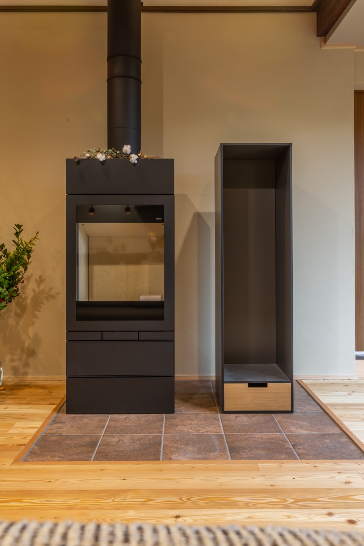ご主人こだわりのスキャンサームの薪ストーブ。鋼板製で熱効率が高く、スタイリッシュな空間に仕上げてくれます。