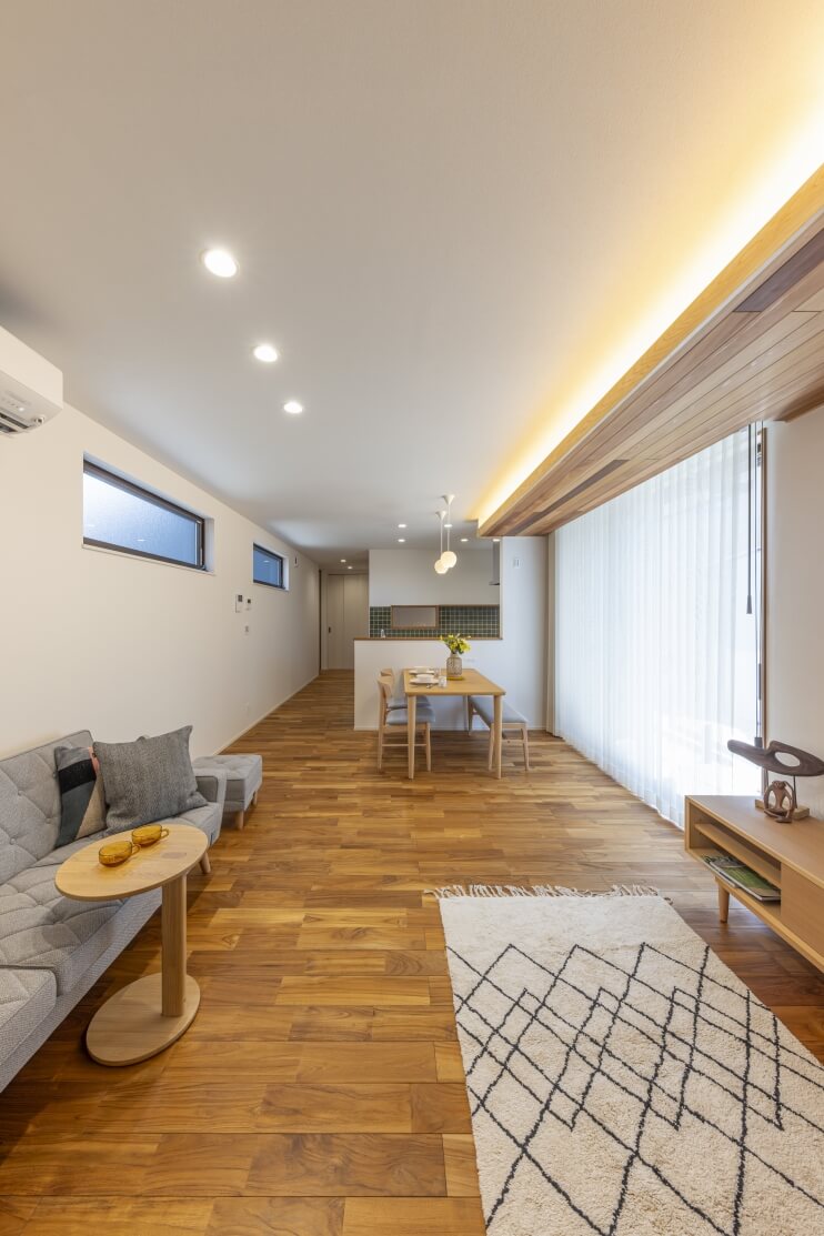 床材や腰板に桧の無垢材を使用。木の香りあふれるリビングに仕上がりました。