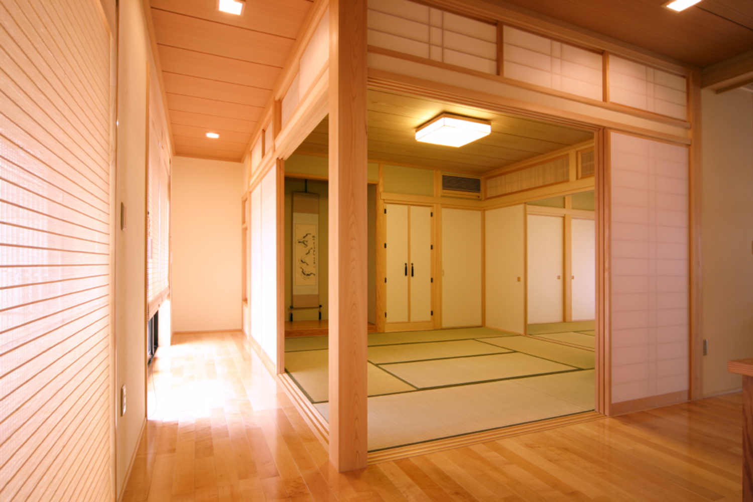 お庭のイメージづくりを先行させ、それを前提にお庭を活かした間取り・外観を考えました。京都の和風住宅や格式のある和風住宅についての雑誌などを参考に、A様とイメージを共有しながらお話を煮詰めました。玄関を入ると正面に南のお庭が広がり、そこにいろはもみじを植え、季節が感じられるようになっています。脇には松の変木を立て(その木は設計担当とご主様が一緒に探しに行き一緒に決めました)玄関の見せ場となっています。