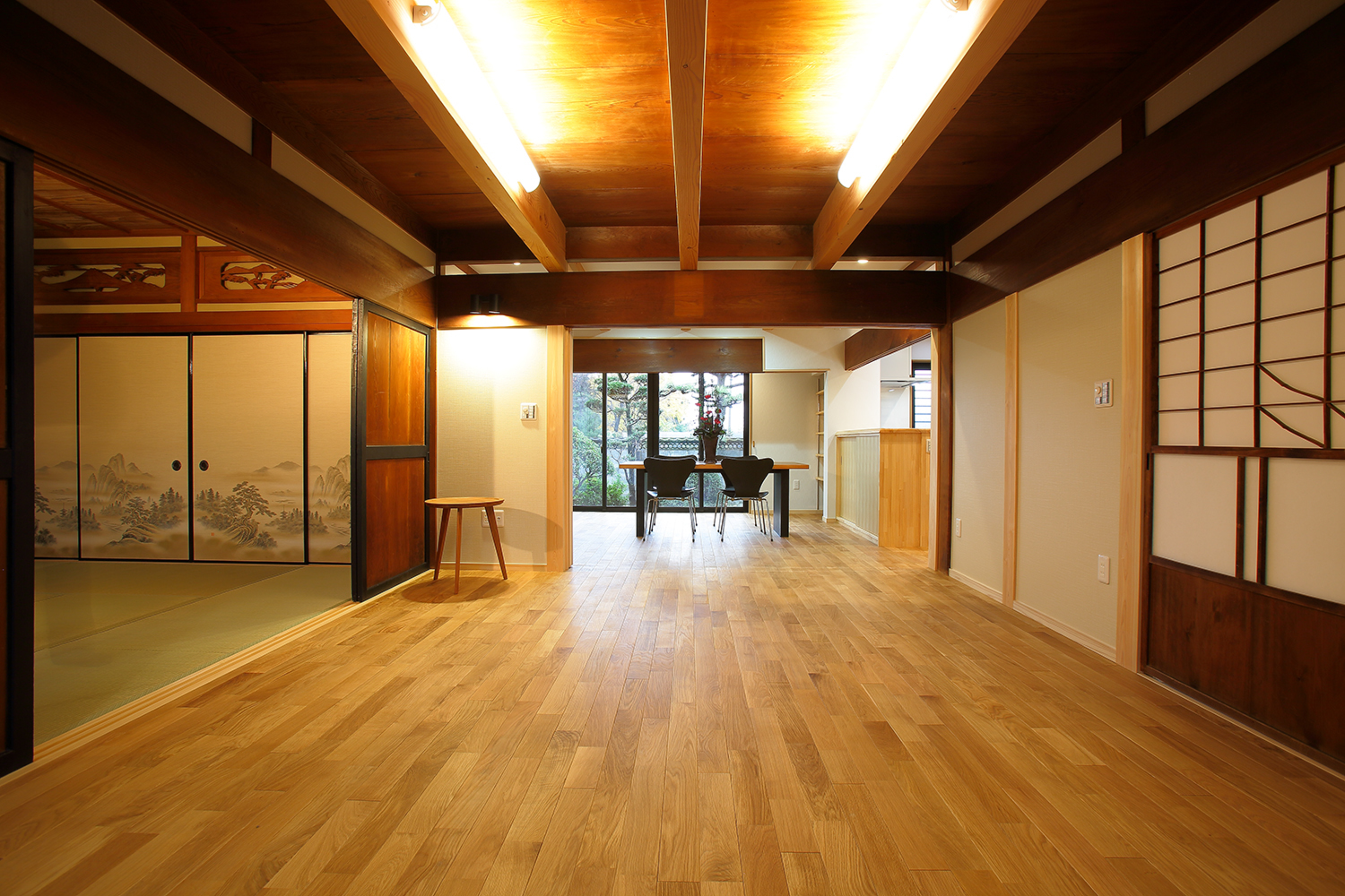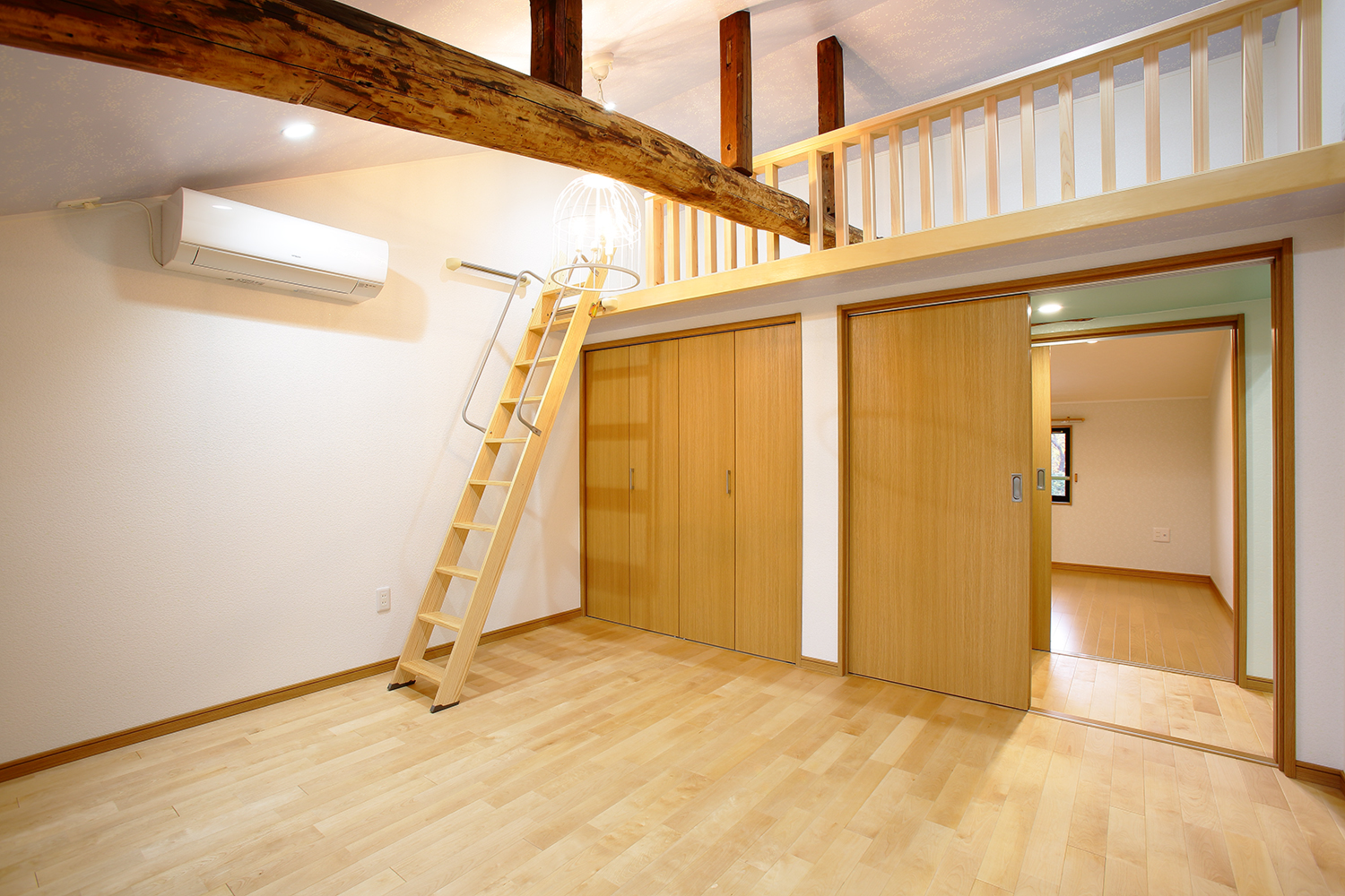 築62年、奥様の祖父が建てた愛着ある住まい。ご主人のご要望通り耐震強度をあげて丈夫にしました。また機能性を重視して、移動しやすい動線計画、明るくて暖かい住まいを希望しました。大工棟梁の提案で玄関は旅館のように落ち着いた雰囲気に。玄関の手摺は敷地内にあった木を加工しました。かつて中2階で低かった天井も勾配天井にして梁を表し、空間に奥行と遊び心を加味したロフトを設けました。2階の図書スペースでは、奥様の夢であるハンモックに揺られながら読書をすることも実現しました。