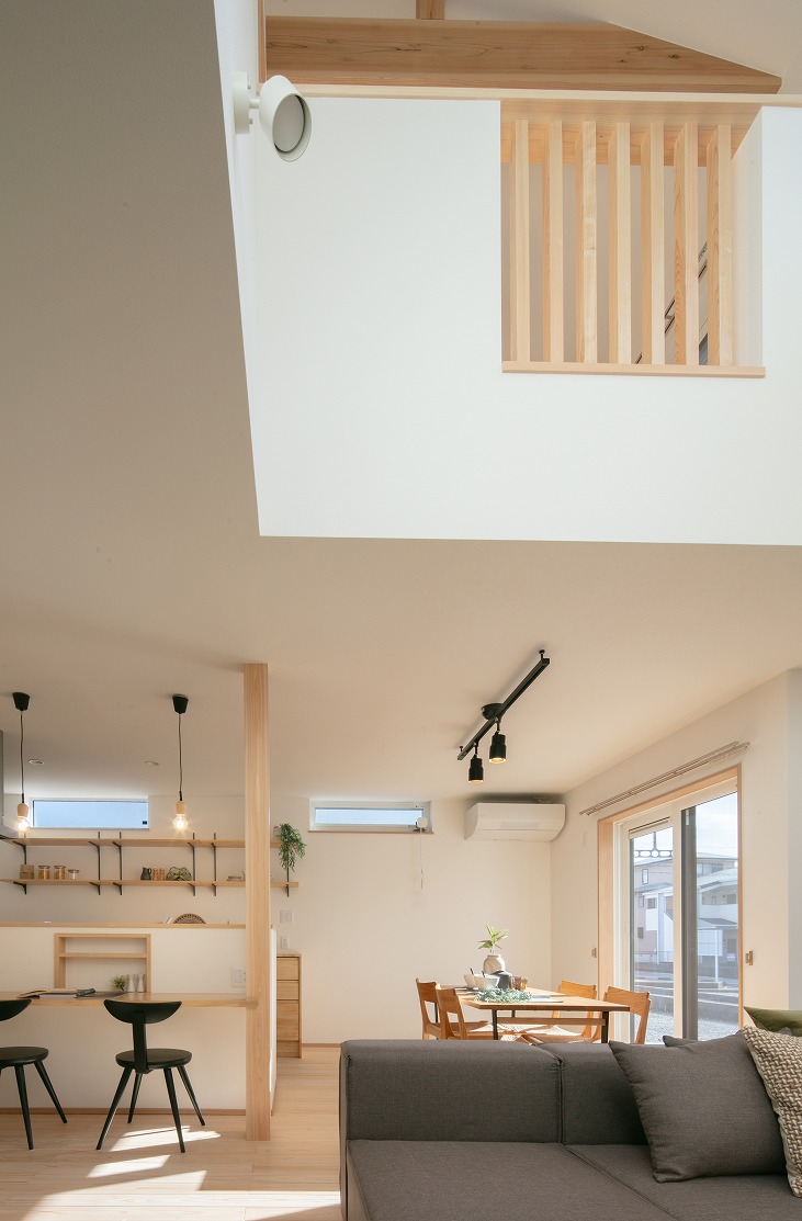 T様は地域の景観に合う事、猫ちゃんと楽しく暮らせる事をご要望されていました。存在感のある大屋根や色遣いは地域に馴染み、リビングではソファでT様が、杉の梁上では猫ちゃんがとご家族みなさまにくつろいでいただけます。