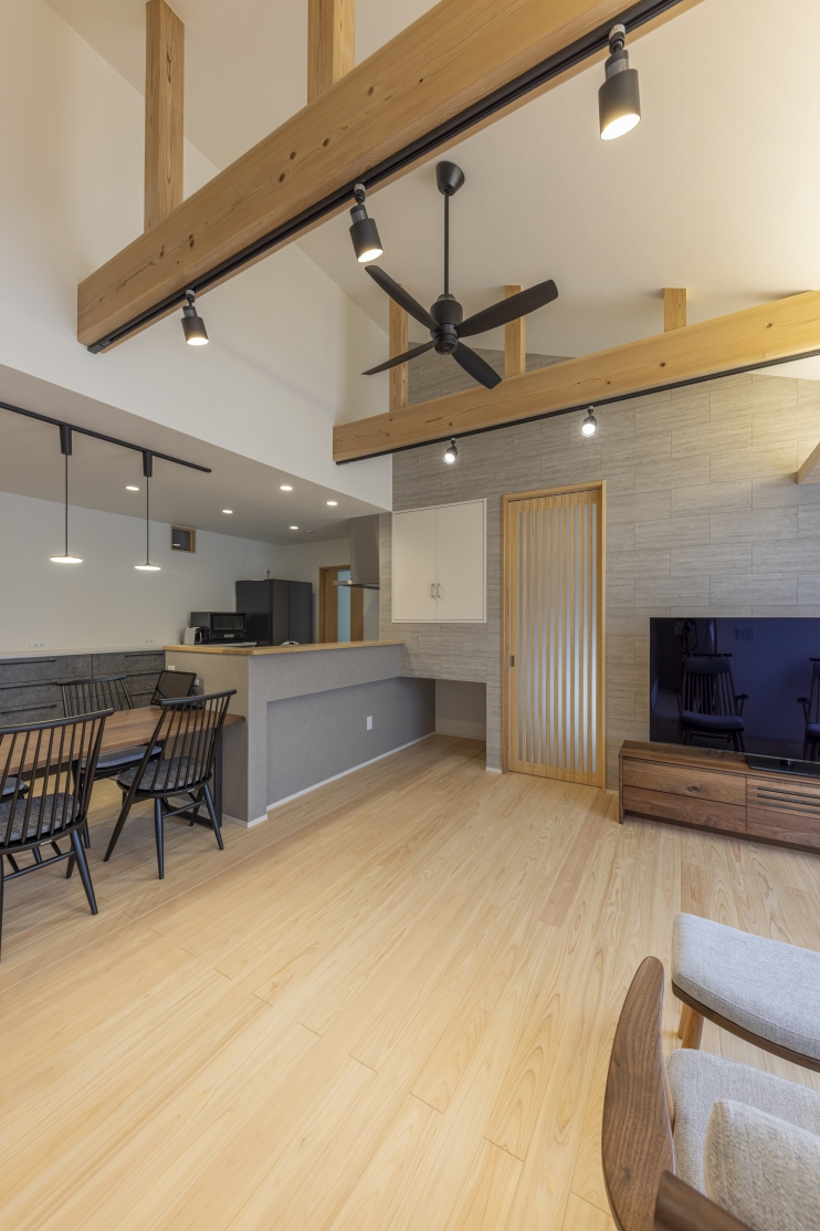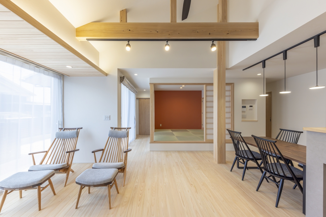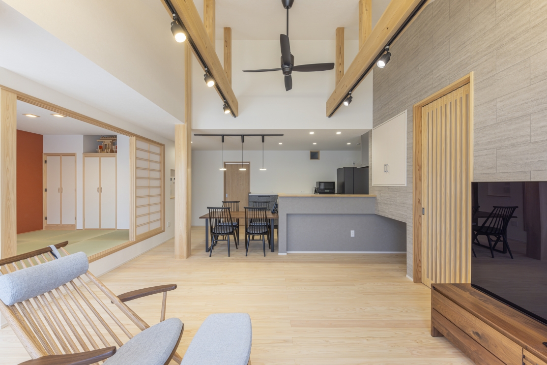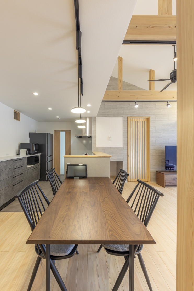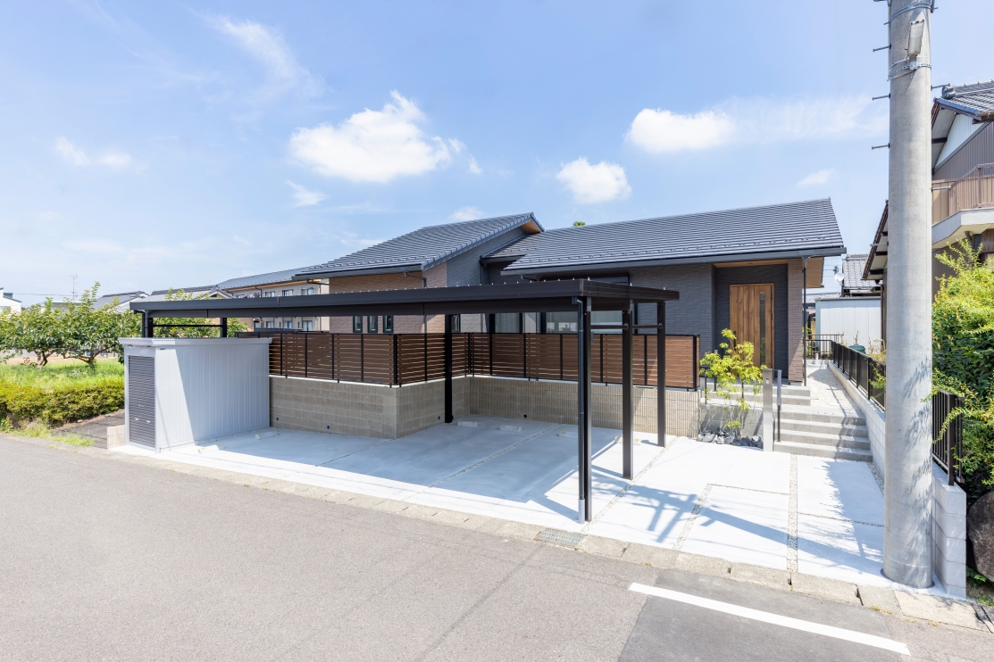 #注文住宅, #家族構成, #親子3~4人, #ライフスタイル, #子育て世帯, #愛犬と暮らす家, #外観, #スタイル, #和モダン, #デザイン, #切妻屋根, #外装材, #外装タイル, #部屋別・場所別, #キッチン, #ペニンシュラ型, #I型, #リビング, #勾配天井リビング, #リビング収納, #ダイニング, #ダイニング照明, #ダイニングテーブル, #ダイニングチェア, #ダイニング収納, #玄関, #和室, #タタミコーナー, #小上がり畳, #収納, #シューズクローク, #ニッチ, #土間収納, #玄関収納, #ユーティリティールーム, #内装, #和モダン, #勾配天井, #下がり天井, #土間, #内装材, #桧, #羽目板天井張り, #デザインウォール, #造作, #造作棚, #造作建具, #造作収納, #外構・エクステリア, #地域・エリア, #岐阜県, #可児市, #階数, #平屋, #面積, #30~40坪, #その他・追加