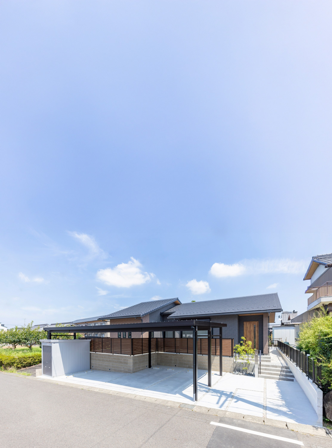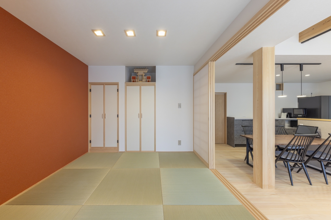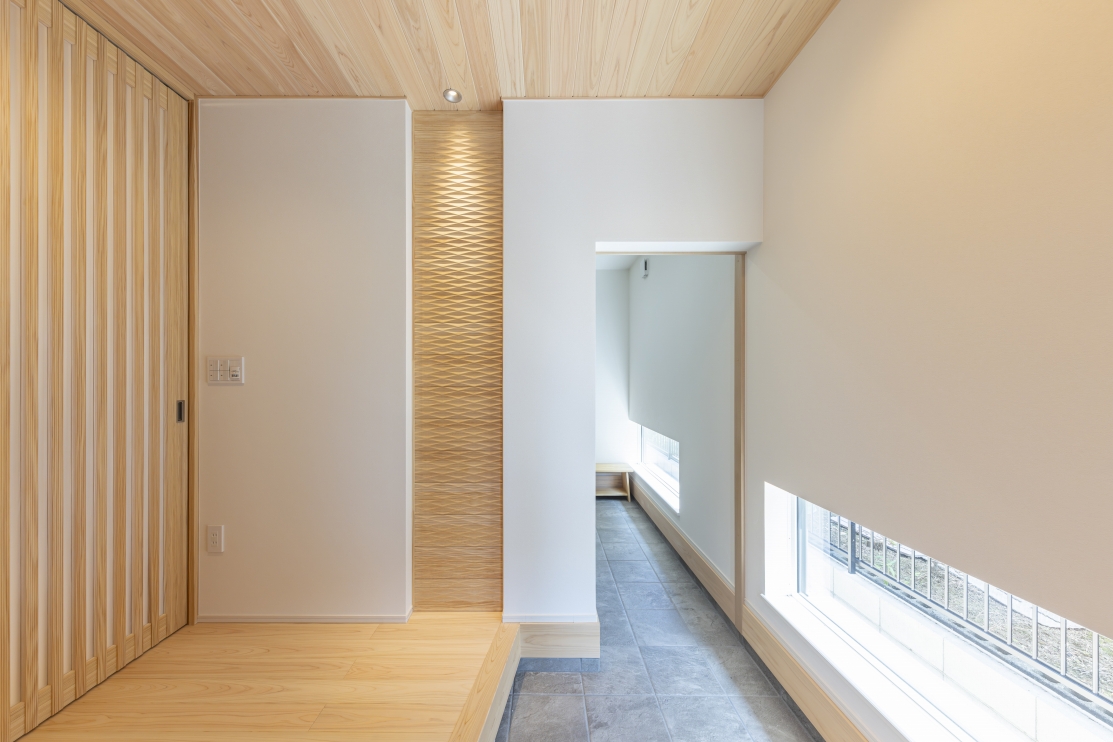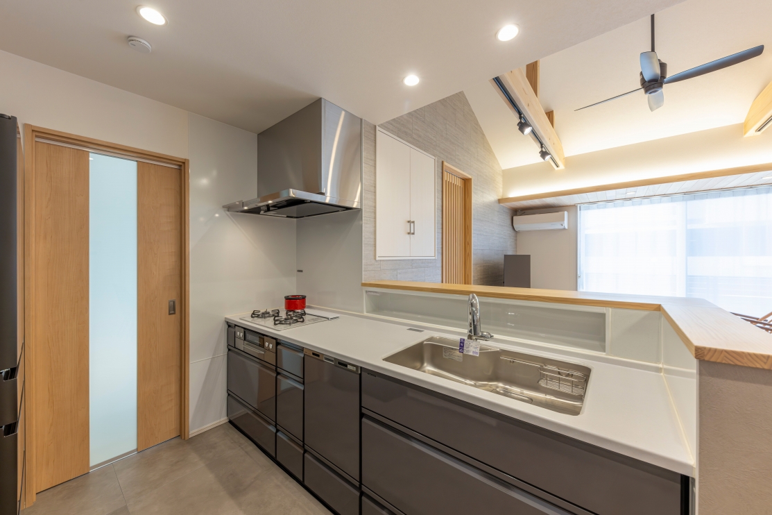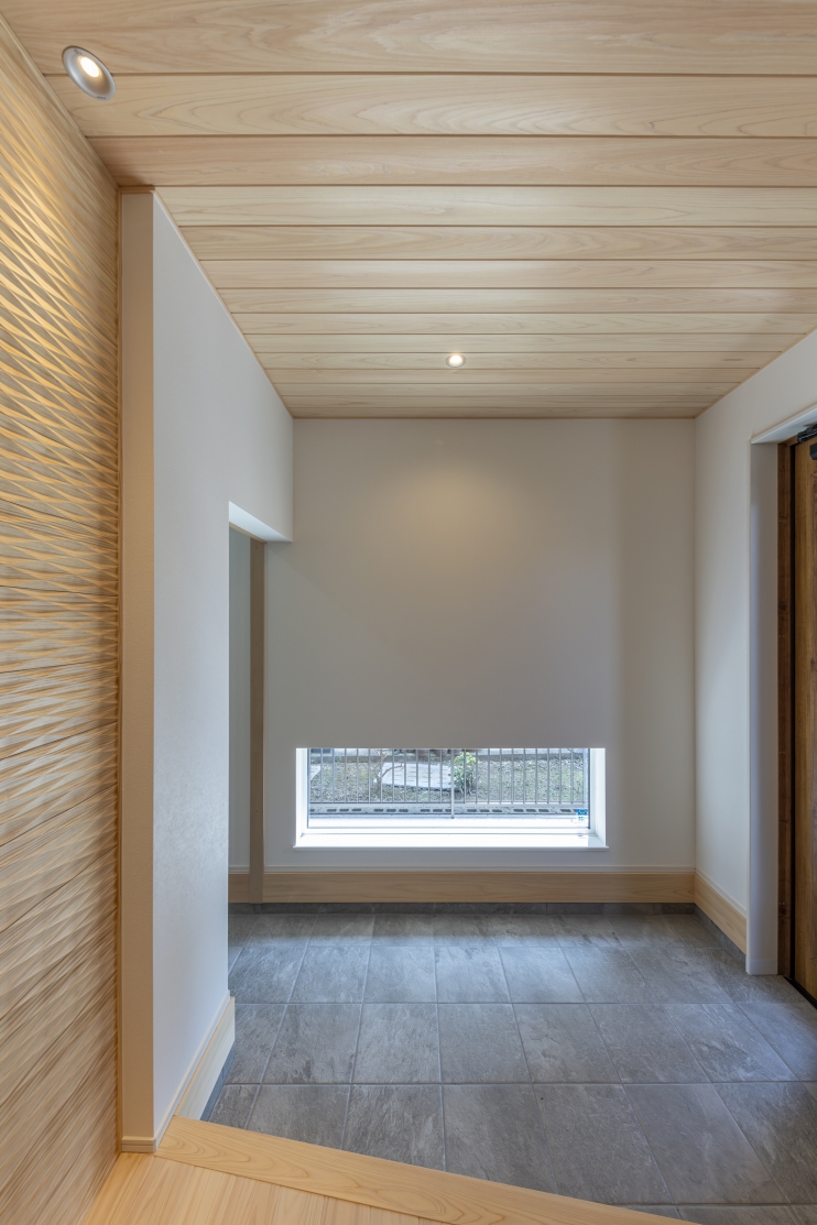 #注文住宅, #家族構成, #親子3~4人, #ライフスタイル, #子育て世帯, #愛犬と暮らす家, #外観, #スタイル, #和モダン, #デザイン, #切妻屋根, #外装材, #外装タイル, #部屋別・場所別, #キッチン, #ペニンシュラ型, #I型, #リビング, #勾配天井リビング, #リビング収納, #ダイニング, #ダイニング照明, #ダイニングテーブル, #ダイニングチェア, #ダイニング収納, #玄関, #和室, #タタミコーナー, #小上がり畳, #収納, #シューズクローク, #ニッチ, #土間収納, #玄関収納, #ユーティリティールーム, #内装, #和モダン, #勾配天井, #下がり天井, #土間, #内装材, #桧, #羽目板天井張り, #デザインウォール, #造作, #造作棚, #造作建具, #造作収納, #外構・エクステリア, #地域・エリア, #岐阜県, #可児市, #階数, #平屋, #面積, #30~40坪, #その他・追加