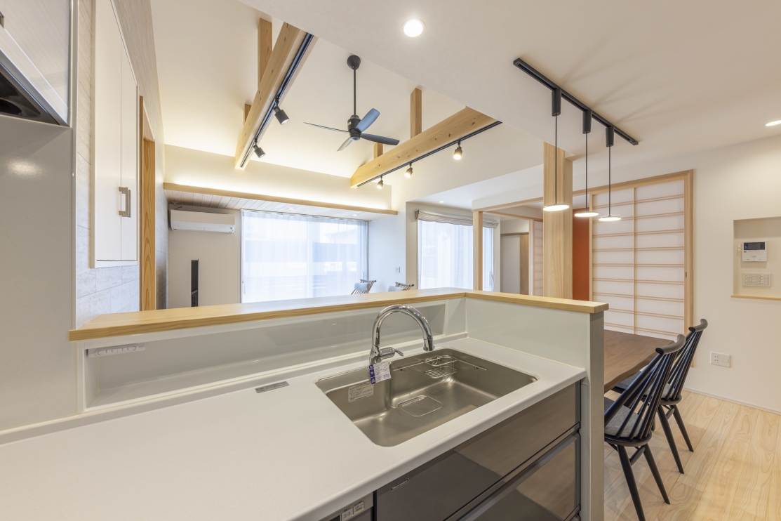 木目を基調とした温かみのあるダイニング空間です。キッチンと直線でつながるレイアウトにより、家事動線が短く使いやすい点が特長です。勾配天井と化粧梁が生み出す開放感が、日々の食事をより心地よい時間にしてくれます。