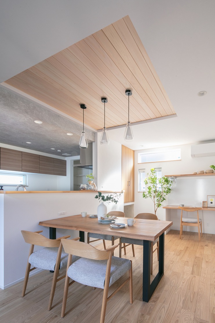#注文住宅, #親子3~4人, #家族構成, #内装, #スタイル, #ナチュラルモダン, #羽目板天井張り, #和室, #タタミコーナー, #小上がり畳, #寝室, #収納, #ファミリークローゼット, #ニッチ, #小屋裏収納, #書斎, #ランドリールーム, #リビング, #リビング学習, #吹き抜けリビング, #キッチン, #ペニンシュラ型, #I型, #桧, #トイレ, #洗面所, #ライフスタイル, #愛犬と暮らす家, #子育て世帯, #吹き抜け, #折り上げ天井, #小上がりスペース, #造作, #造作収納, #造作棚, #造作カウンター, #内装材, #栗, #愛知県, #名古屋市, #階数, #二階建て, #面積, #30~40坪