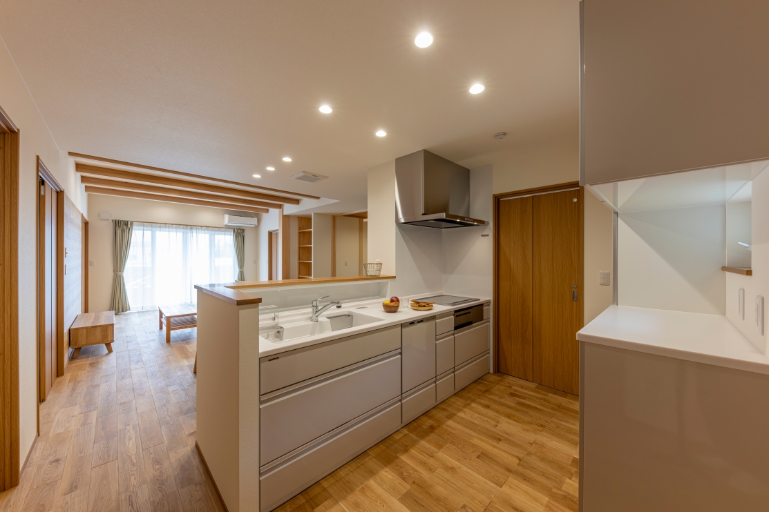 #注文住宅, #家族構成, #親子3~4人, #内装, #ライフスタイル, #二世帯, #キッチン, #ペニンシュラ型, #I型, #リビング, #ダイニング, #玄関, #大壁和室, #小上がり畳, #寝室, #収納, #パントリー, #ユーティリティールーム, #スタイル, #ナチュラルモダン, #折り上げ天井, #オーク(ナラ), #内装材, #地域・エリア, #岐阜県, #瑞浪市, #階数, #平屋, #面積, #30~40坪