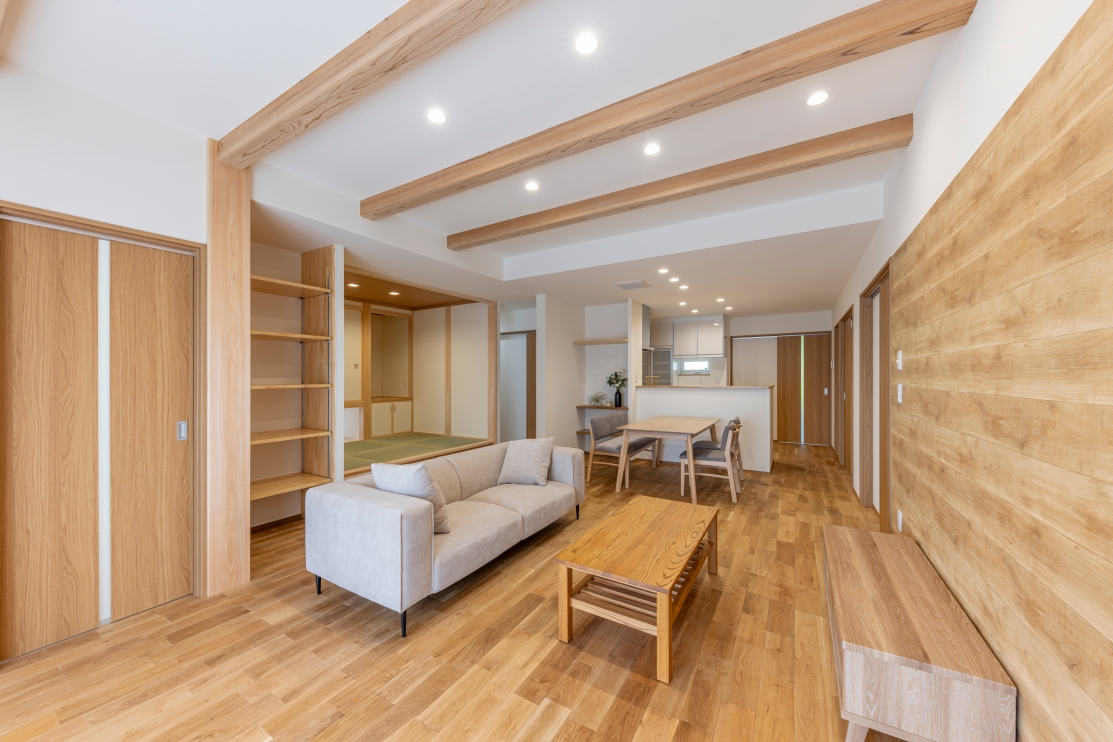 特徴 | 平屋 小上がり和室 造作カウンター スタディーコーナー ナチュラルモダン 小屋裏スペース |