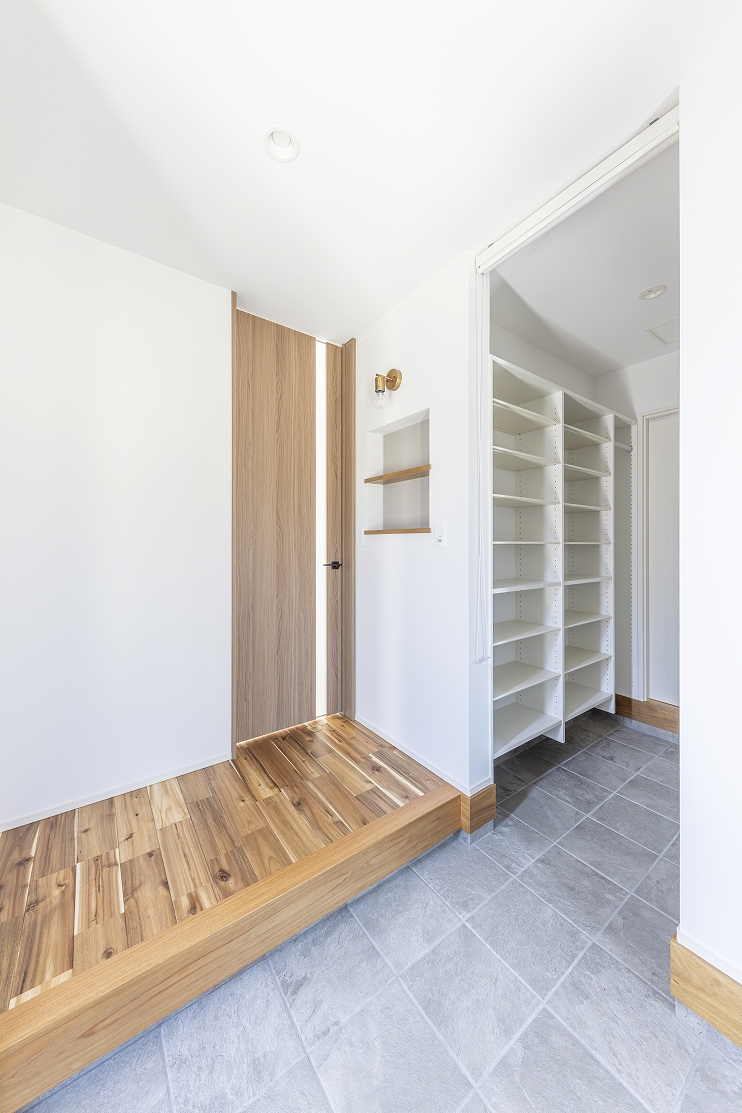 #注文住宅, #家族構成, #親子3~4人, #ライフスタイル, #子育て世帯, #共働き世帯, #外観, #スタイル, #シンプルモダン, #デザイン, #切妻屋根, #片流れ屋根, #外装材, #サイディング, #部屋別・場所別, #キッチン, #ペニンシュラ型, #リビング, #吹き抜けリビング, #リビング収納, #リビング照明, #アウトドアリビング(ウッドデッキ), #ダイニング, #ダイニング照明, #玄関, #和室, #タタミコーナー, #収納, #ウォークインクローゼット, #シューズクローク, #ニッチ, #小屋裏収納, #ユーティリティールーム, #ロフト, #内装, #シンプルモダン, #吹き抜け, #内装材, #アカシア, #エコカラット, #内装タイル, #デザインウォール, #造作, #造作手洗いコーナー, #造作棚, #造作洗面台, #造作カウンター, #造作収納, #外構・エクステリア, #地域・エリア, #岐阜県, #美濃加茂市, #階数, #平屋, #面積, #20~30坪