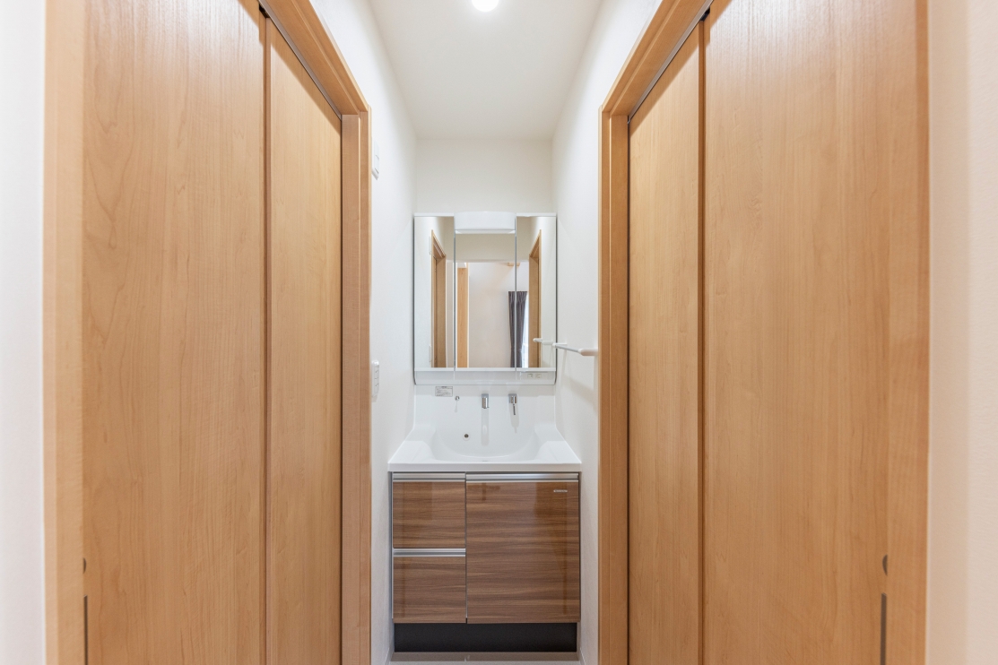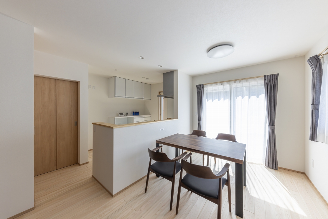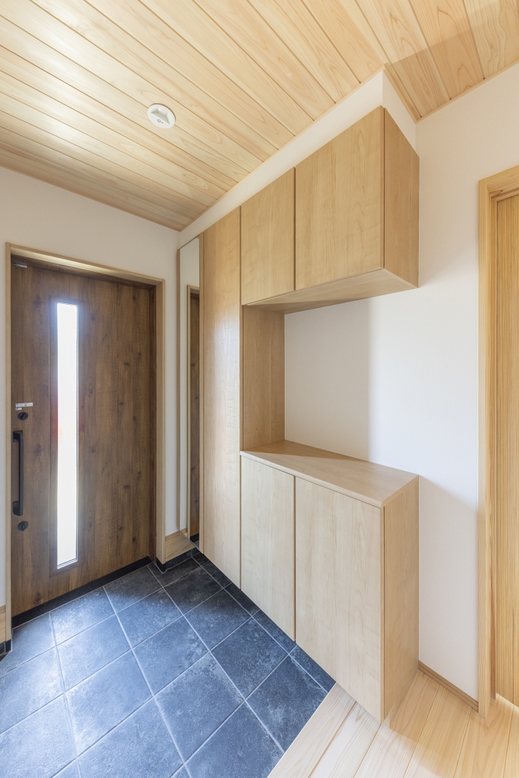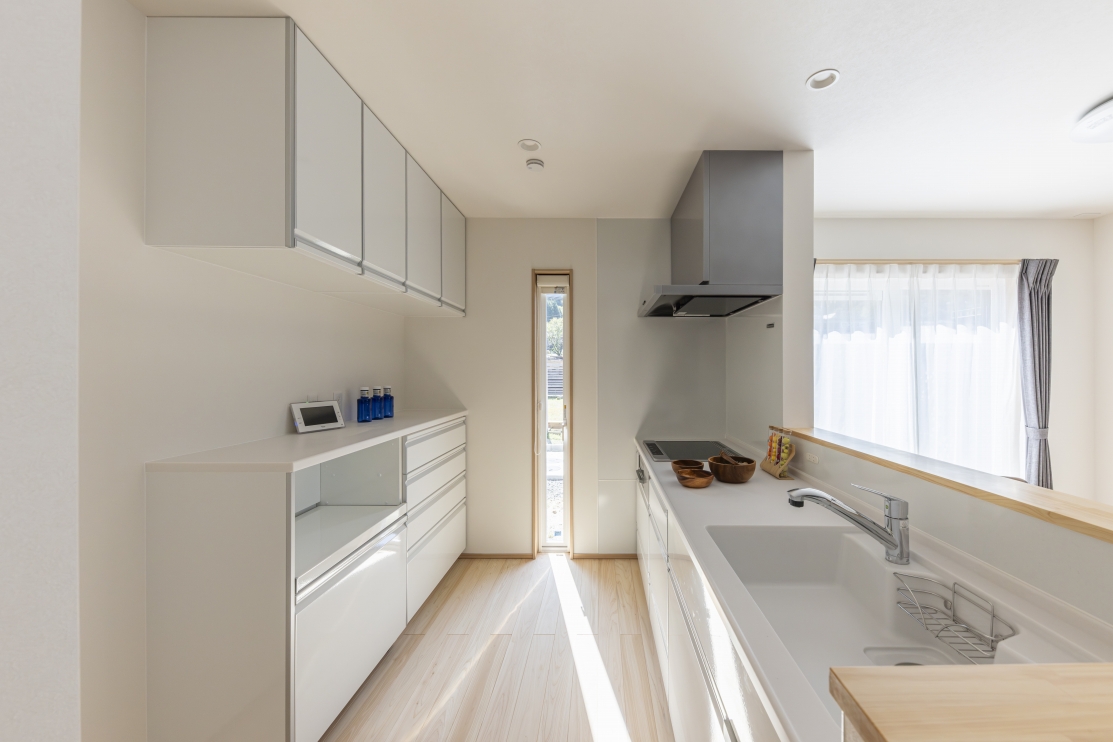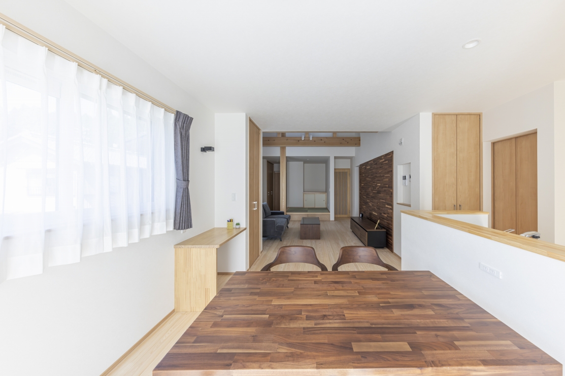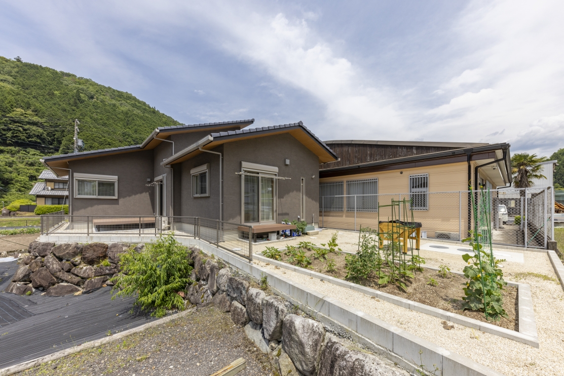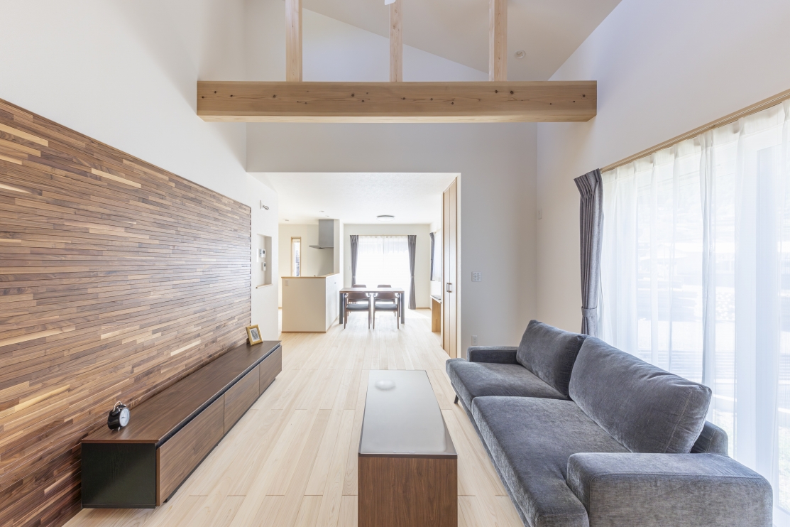 変形の土地という点を活かしながらのご計画でした。日当たりの課題は、土地の利を活かし菜園ができるお庭とリビングに大きな吹抜け、上部に窓を付けたことにより明るいお住まいとなりました。見学会もさせていただき、来ていただいた皆さんに好評でした。