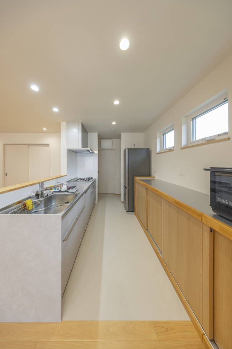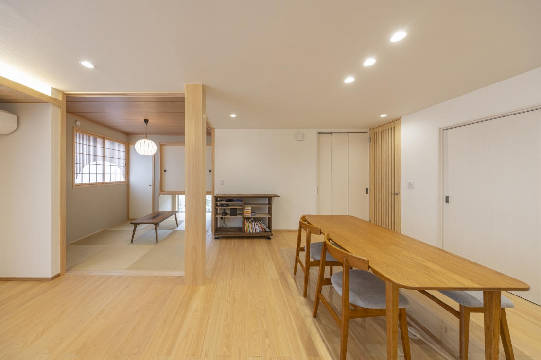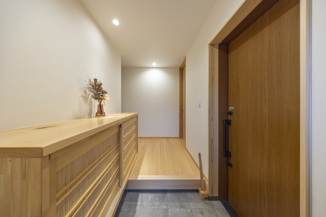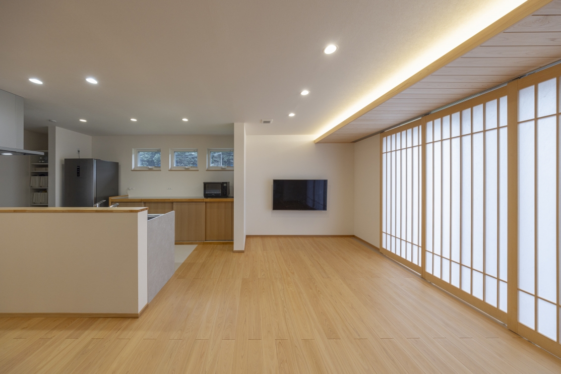 #内装, #注文住宅, #造作, #造作収納, #内装材, #羽目板天井張り, #桧, #ライフスタイル, #子育て世帯, #塗り壁, #木目, #部屋別・場所別, #キッチン, #ペニンシュラ型, #I型, #リビング, #ダイニング, #玄関, #和室, #大壁和室, #収納, #ウォークインクローゼット, #玄関収納, #ユーティリティールーム, #造作建具, #和風, #和モダン, #下がり天井, #新城市, #外観, #スタイル, #和風, #和モダン, #デザイン, #切妻屋根, #格子, #外装材, #外構・エクステリア, #愛知県, #階数, #平屋, #面積, #30~40坪