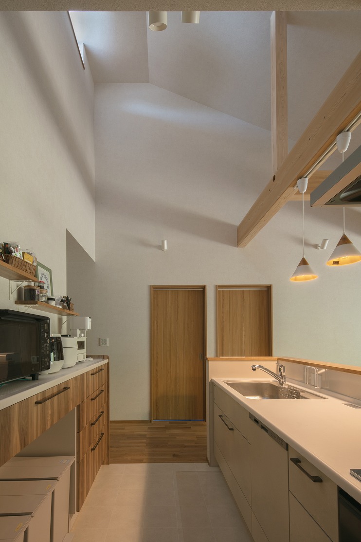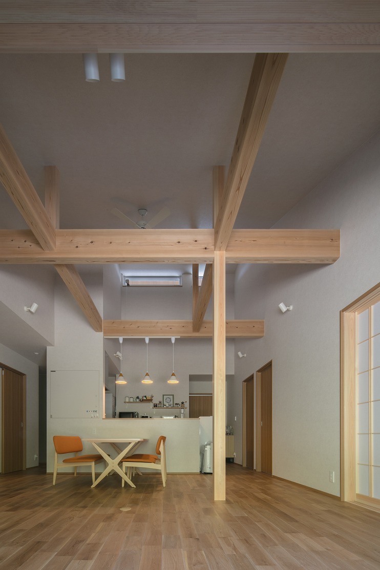 特徴 回遊動線 平屋 大容量の収納 梁あらわし 勾配天井 珪藻土 無垢床