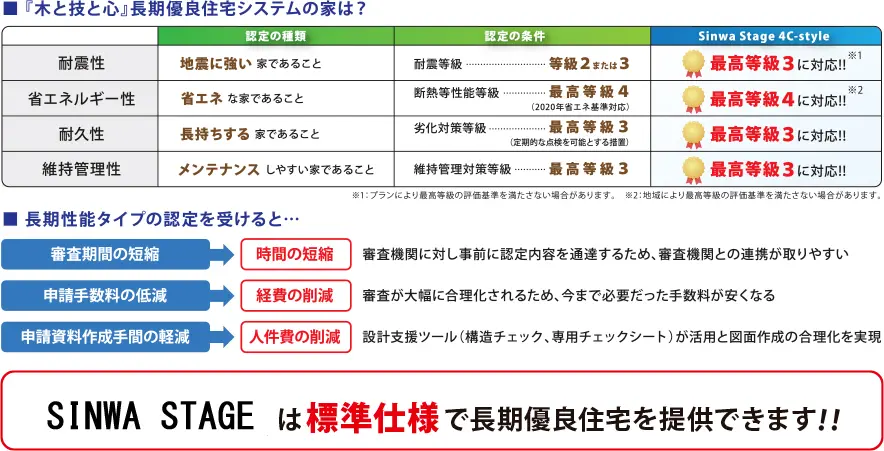 今まで、長期優良住宅として国の認定をもらうには、申請してから建築完成まで7ヶ月~8ヶ月、膨大な提出書類を作成し、そのコストも決して少額ではありませんでした。そこで新和建設は、申請審査を短縮できる、木造建築合理化システム「長期性能タイプ」の認定を、国土交通省の認定機関より取得することで、これまでかかっていた費用と時間の軽減に成功しました。