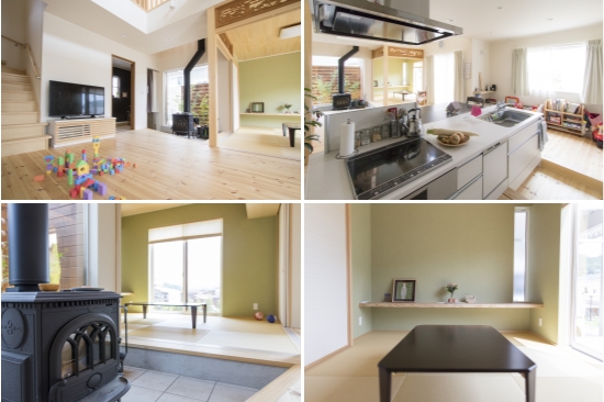 玄関に入ると、右手には大型シューズボックス、正面には使い勝手の良い納戸があります。玄関土間はリビングとその奥の和室まで続き、お客様が靴のままでもゆっくりくつろぐことができます。薪ストーブ横の大きなフィックス窓の向こうには、目隠しの格子をバックに緑が映えます。ご主人がショールームで気に入り、取り入れたそうです。和室には奥様のご実家の立派な欄間が再利用されています。リビングをより心地よい空間にしたいと、初期の設計図から部屋を1つ減らし、吹き抜けと2階バルコニーを広くとりました。夏はお嬢様がバルコニーでプール遊びをするのが楽しみだそうです。雲のない夜は2階の丸形のフィックス窓からこぼれる月明かりが、リビングをスポットライトのように照らして幻想的だとか。